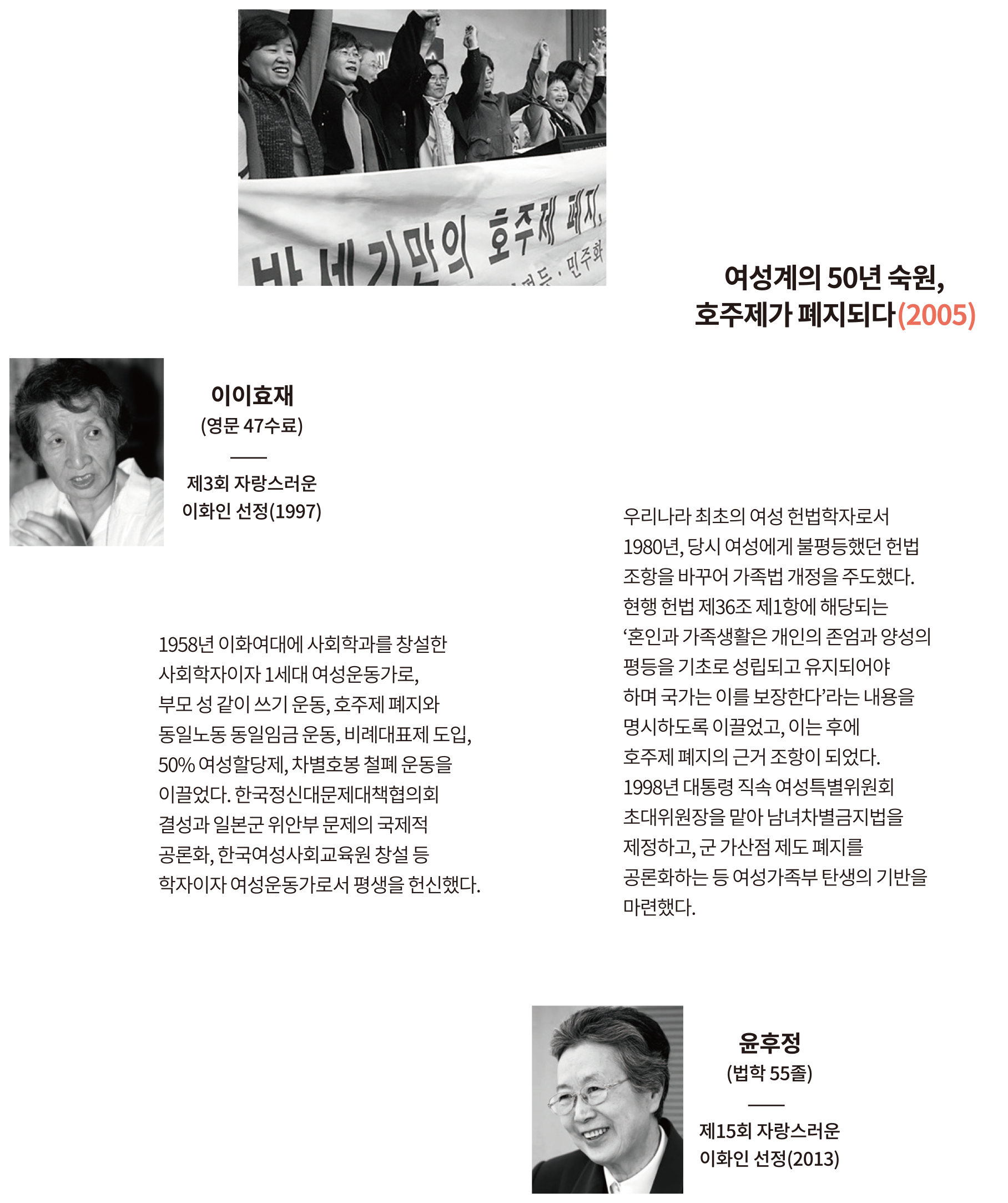 ‘호주제(戶主制)’란 ‘호주’를 중심으로 가족을 구성, 유지하고, 원칙적으로 직계비속남자에게 가(家)를 승계시키는 제도이다. 호주의 승계는 호주의 아들 → 손자 → 미혼인 딸 → 미혼인 손녀 → 배우자 → 어머니 → 며느리의 순서로 남성우월적으로 되어 있다. 호주제는 가족 구성원을 호주에게 종속시켜 개인의 자율성과 존엄성을 부정하고 평등한 가족관계를 해쳤다.