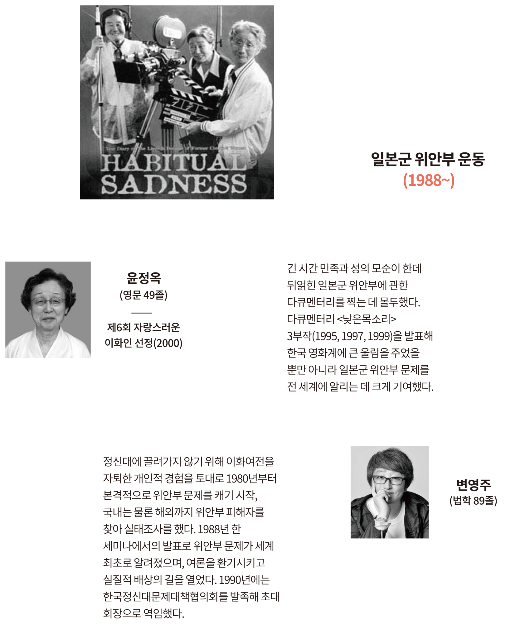 1988년 이화여대 윤정옥 교수의 연구와 발표를 계기로 일본군 위안부 실상이 세계 최초로 알려졌다. 이후 ‘한국정신대문제대책협의회’가 발족(1990)했고, 일본군 위안부 문제를 알리고 일본에 사과와 피해자 보상을 요구하는 운동이 일어났다. 1991년 8월 14일, 故 김학순 씨가 일본군 위안부 피해 사실을 최초로 공개 증언하면서 본격적으로 시작된 일본군 위안부 운동은 수많은 사람들의 연대를 바탕으로 30년 이상 이어져왔다. 변영주 영화감독은 일본군 위안부 피해자들의 증언과 역사의 조각을 모아 다큐멘터리 영화 <낮은 목소리>를 발표해 국제적, 대중적 지지와 연대를 이끌어냈다.