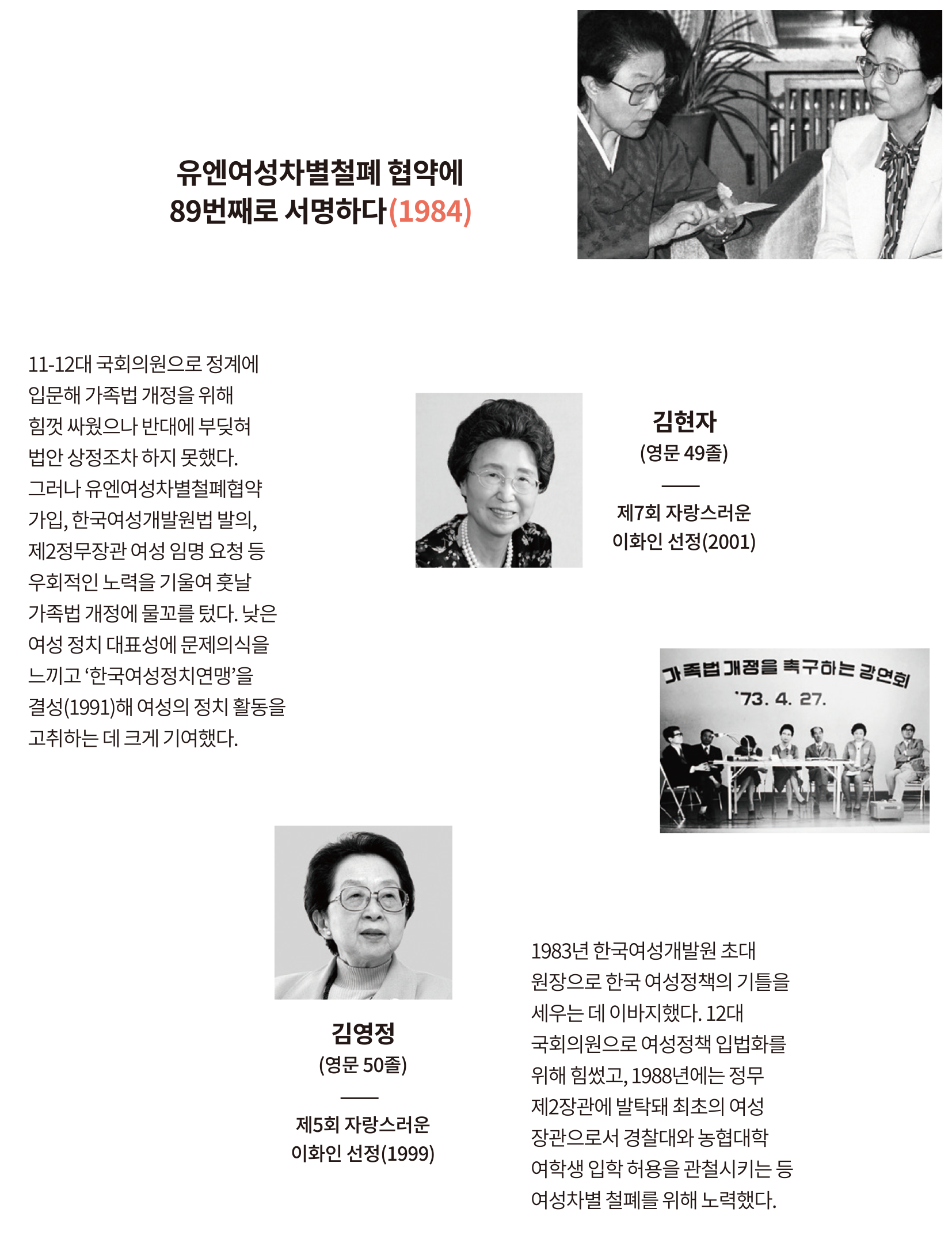 1970년대 은행권에서 여성직원에게 요구한 ‘결혼각서(재직 중 결혼하게 될 경우 자진사직을 서약함)’ 반대 운동과 더불어 교통사고 피해여성의 정년을 25세로 산정해 손해배상액을 산정한 법원의 판결에 불복해 일어난 ‘25세 여성조기정년제 철폐 운동’을 계기로 남녀고용평등법이 제정됐다.