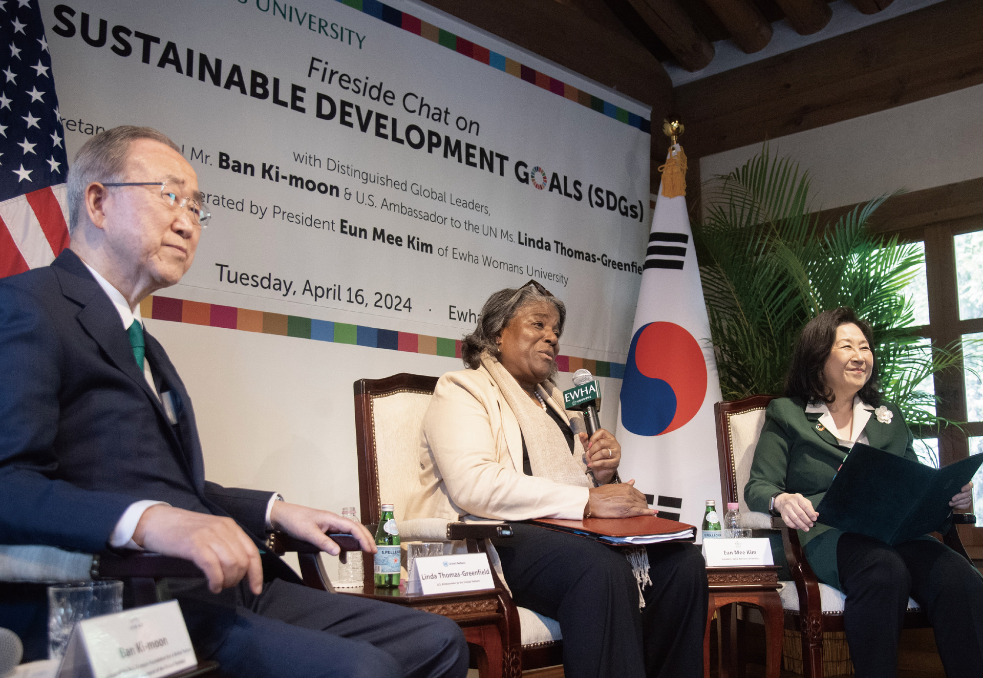 4 | UN지속가능발전목표 김은미 총장과 반기문 전 유엔사무총장, 린다 토머스-그린필드(Linda Thomas-Greenfield) 유엔 주재 미국대사가 4월 16일(화) 이화역사관에서 ‘유엔 지속가능발전목표(UN SDGs)’를 주제로 대담을 나눴다. 토머스-그린필드 대사는 “마틴 루터 킹 목사의 경고처럼 한 지역의 부정의(不正義)는 세계로 퍼져 나가는 위협이 될 수 있으나, 반대로 우리가 서로 협력하면 긍정적인 변화와 결과를 만들 수 있다”며 국가가 국경과 자국 이익을 초월해 협력해야 함을 강조했다. |